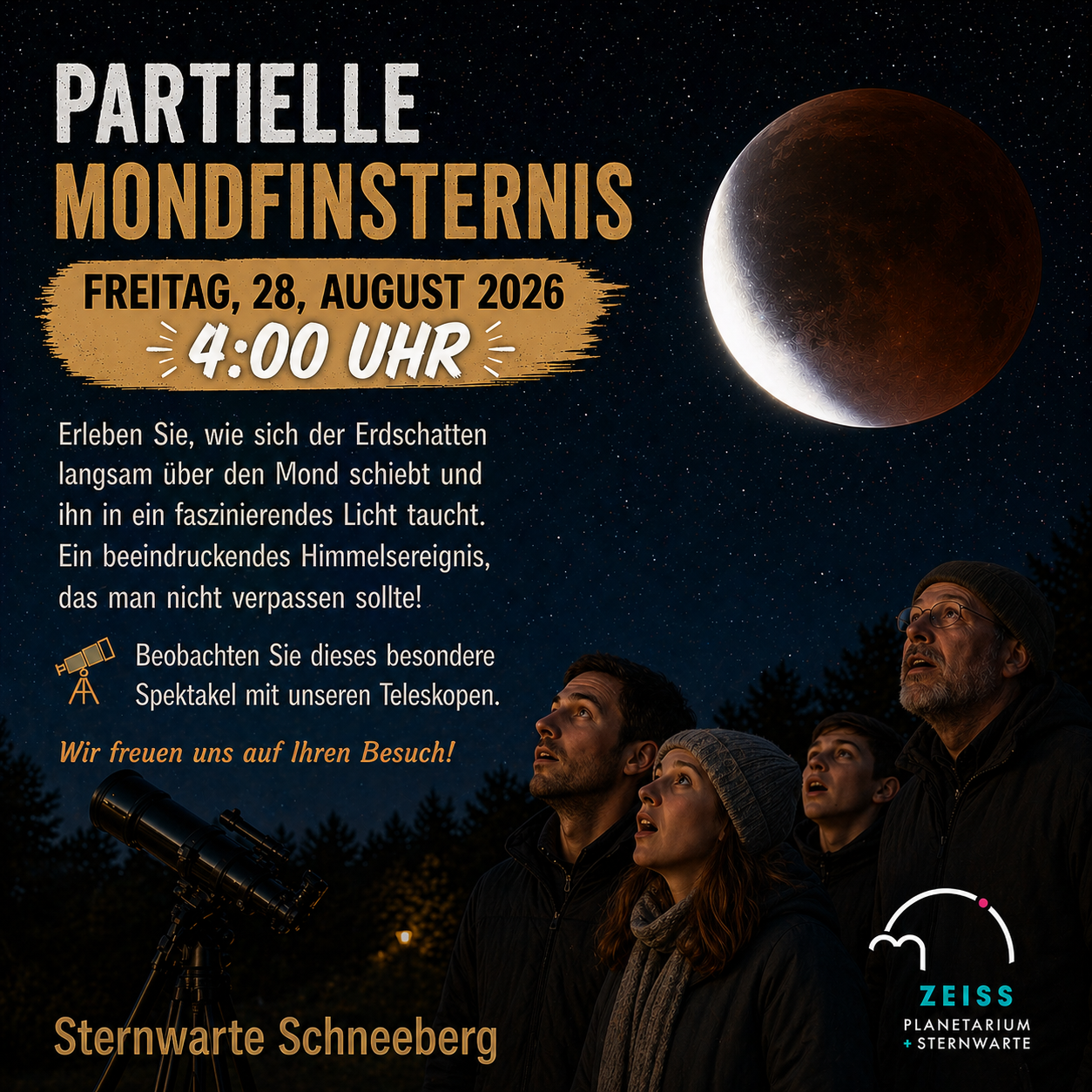 Vor dem Monduntergang (06.22 Uhr) kann ein Beobachter verfolgen, wie sich unser Begleiter in den Erdschatten hinein bewegt. Dabei wird er bis 06.13 Uhr fast vollständig vom Kernschatten verdeckt sein. Danach bewegt er sich bis 07.52 Uhr aus dem Kernschatten der Erde. Das Hineinbewegen des Mondes in den Kernschatten unserer Erde kann gut verfolgt werden. Mit Sonnenaufgang um 06.17 Uhr geht der rötlich eingefärbte Mond unter, so dass der Austritt aus dem Kernschatten nicht zu sehen ist. Verfolgen Sie unter sachkundiger Anleitung dieses himmlischen Spektakels und machen Sie ihr eigenes Finsternis-Foto.